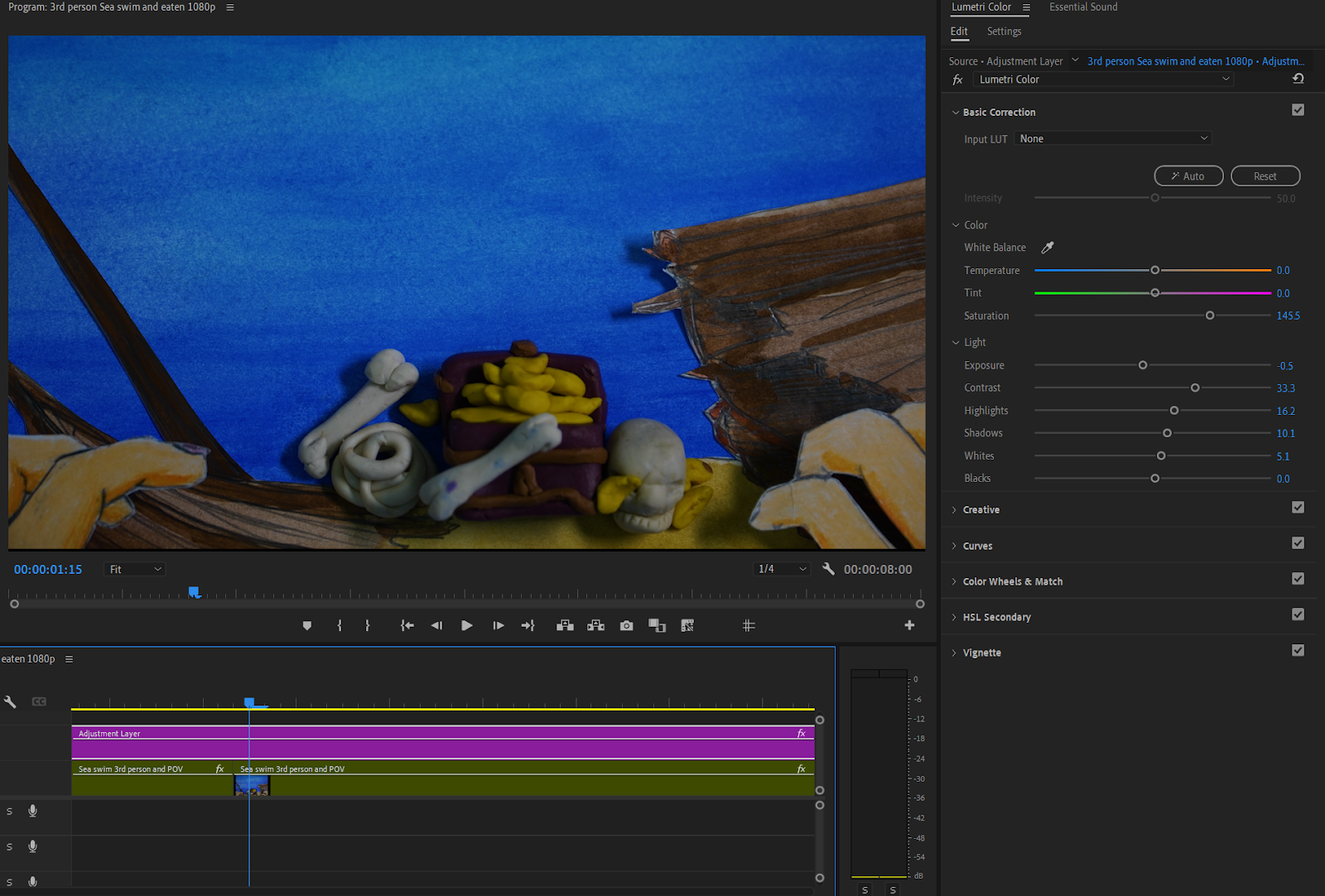 At the same time, I also add adjustment layers to be able to apply colour corrections and grading to fit the surroundings for each scene: high up in the sky (brighter scene), deep in the ocean (low light) and stranded in spaces (darker background)